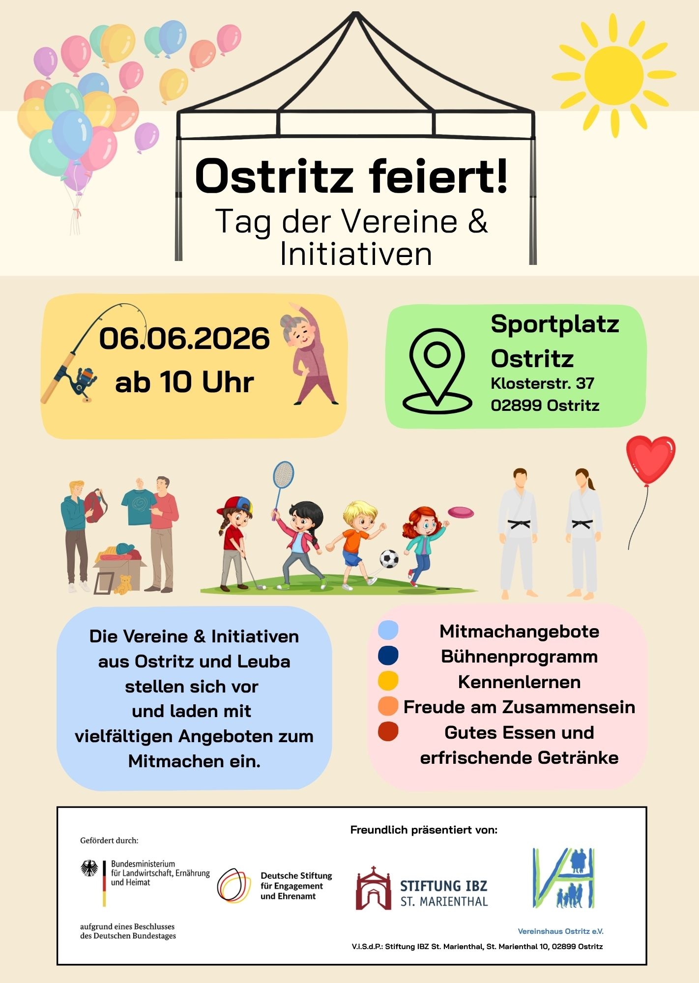 Beim Vereinsfest in Ostritz am 06.06.2026 wird der Sportplatz zum Treffpunkt regionaler Vereine & Initiativen. Unser Vereinsfest lädt zum Entdecken und Mitmachen ein. An diesem Tag wird ehrenamtliches Engagement vor Ort erlebbar gemacht. Von 10 bis 17 Uhr können an den Ständen vielfältige Angebote ausprobiert werden. Hier ist für alle etwas dabei , ob Geschicklichkeitsspiele, Rätsel, oder Sport und Spaß für Groß und Klein. Probiert euch aus, beispielsweise beim Kegeln, Torwandschießen, Castingsport(Angeln) oder beim kreativen Basteln. Für die Kleinsten ist mit einer Spielstraße und einer Hüpfburg ebenfalls gesorgt. Zudem besteht die Gelegenheit das Flizzy – Kindersportabzeichen von Landessportbund Sachsen zu erlangen. Wer mitmacht, wird belohnt. An den Ständen können Stempel gesammelt und damit Preise gewonnen werden. Ergänzt wird das Fest durch ein abwechslungsreiches Programm mit Hundeparcour , Tombola, Judovorführung und musikalischen Akzenten aus Süditalien mit Tarantella-Tanz zum Mitmachen. Ab 15 Uhr kann dann beim Fußballspiel Ostritzer BC gegen SV Gebelzig mitgefiebert werden. Auch für das leibliche Wohl ist bestens gesorgt. Es werden Speisen vom Grill, vegetarisches Essen und erfrischende Getränken angeboten.